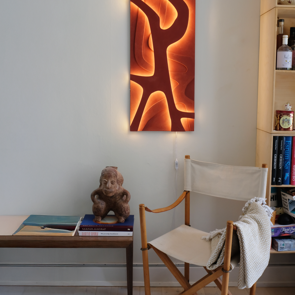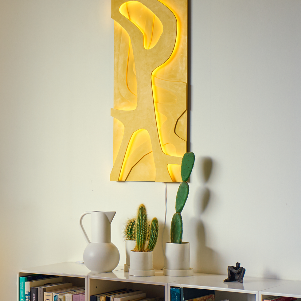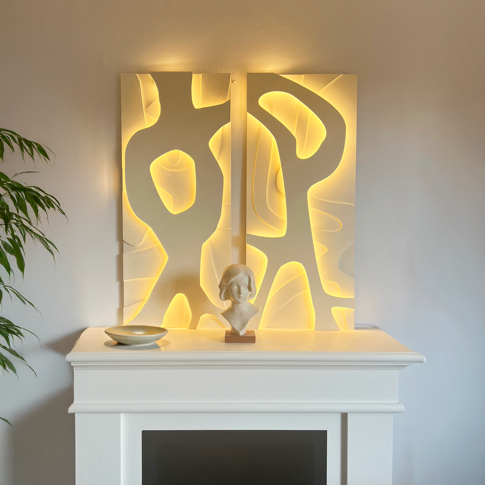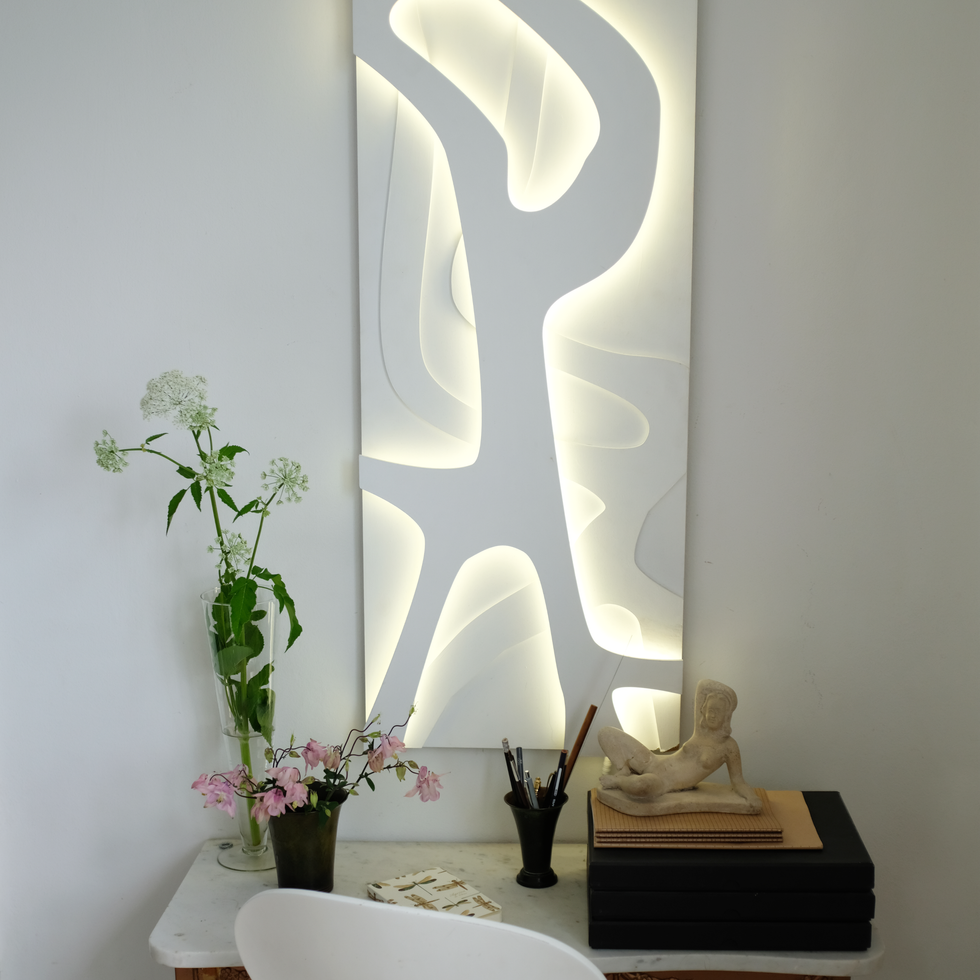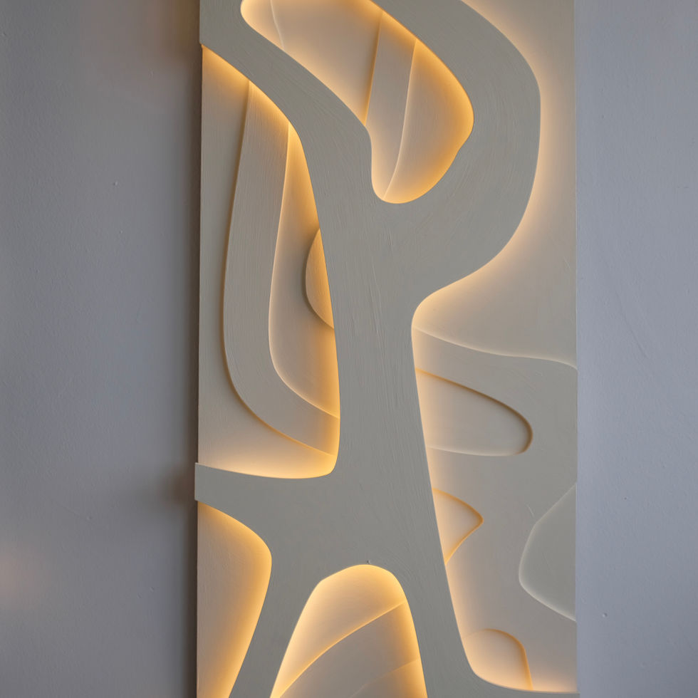 An interplay of negative space and illuminated relief. The carved forms catch light in different luminance levels, balancing precision and fluidity in a strong, graphic composition.
